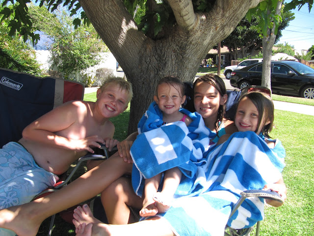 We left our friends and headed to my dad's house for swimming and dinner. The girls have been living in the pool on the weekends this summer. I remember growing up having a green tint to my hair from all the chlorine. So far, they are good. The girls absolutely love to jump off the diving board.